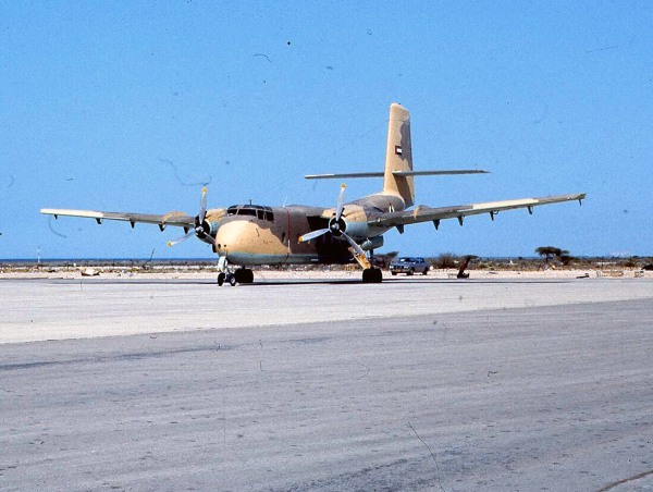 Northern Oman. This photograph by Peter Justin shows a Caribou at Seeb Airport. These aircraft were used extensively for movements to the jebel in Dhofar but were being phased out of service in 1975-76
