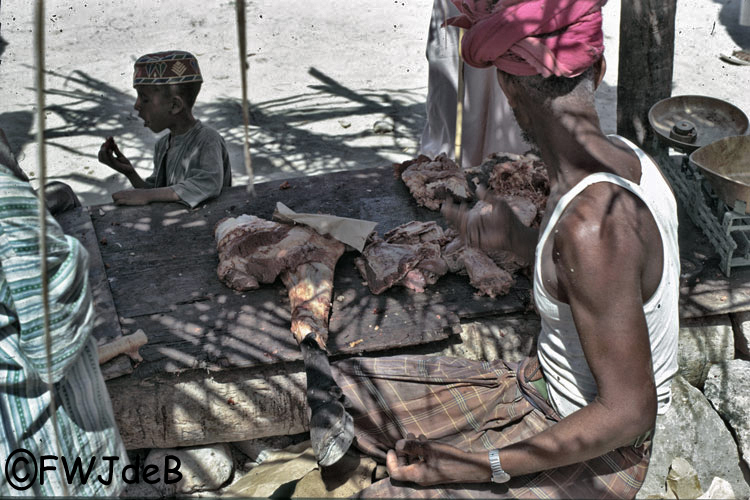TP23 : The local butcher with the remains of a cow. In later years when the jebel was more prosperous there were reports that there were too many camels and that their grazing was restricted. An outlet for camel meat was suggested and even for camel milk in Dubai.